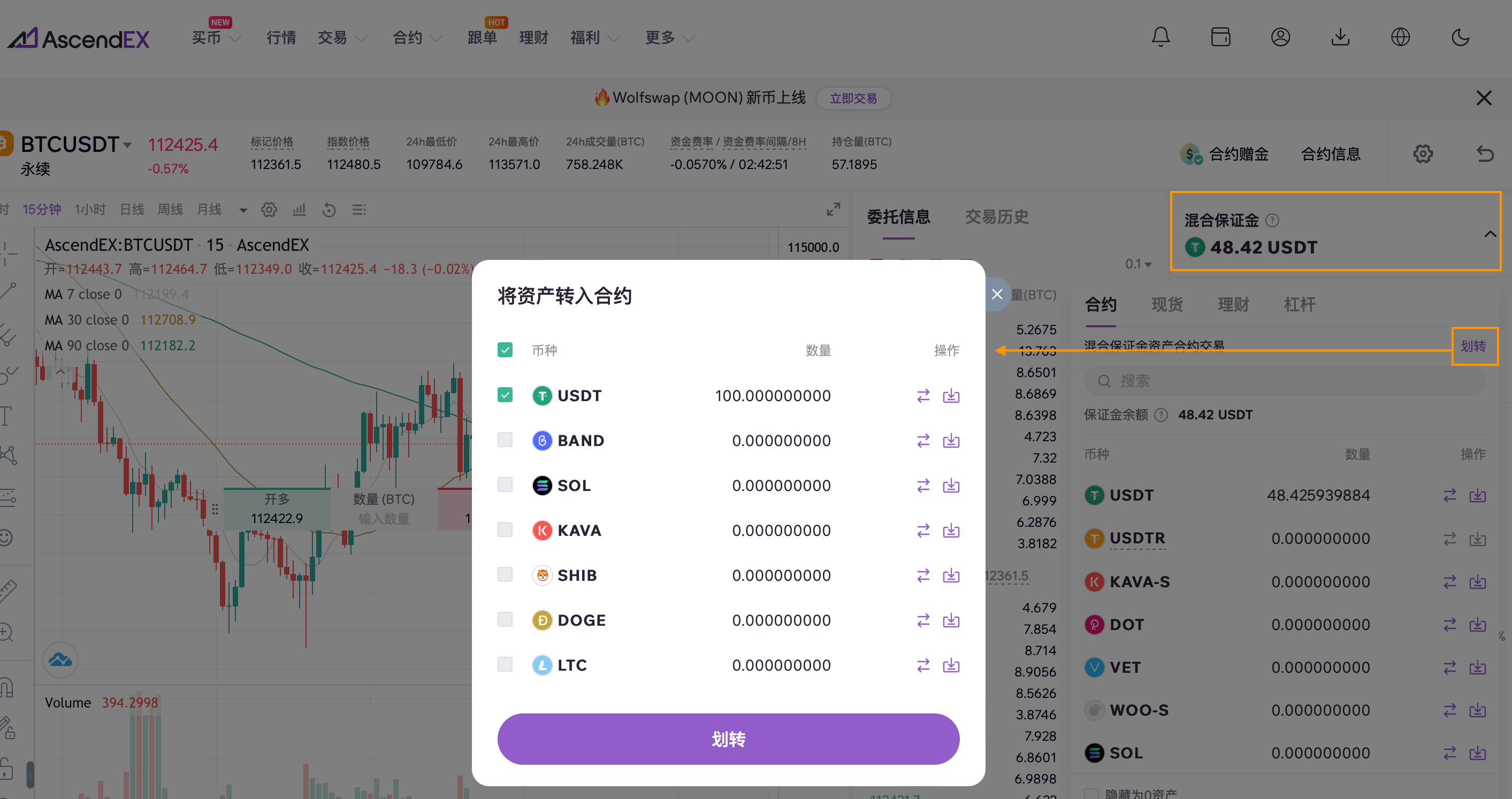 PC端:合约交易页面 - 混合保证金 - 划转 (支持资产批量划转)