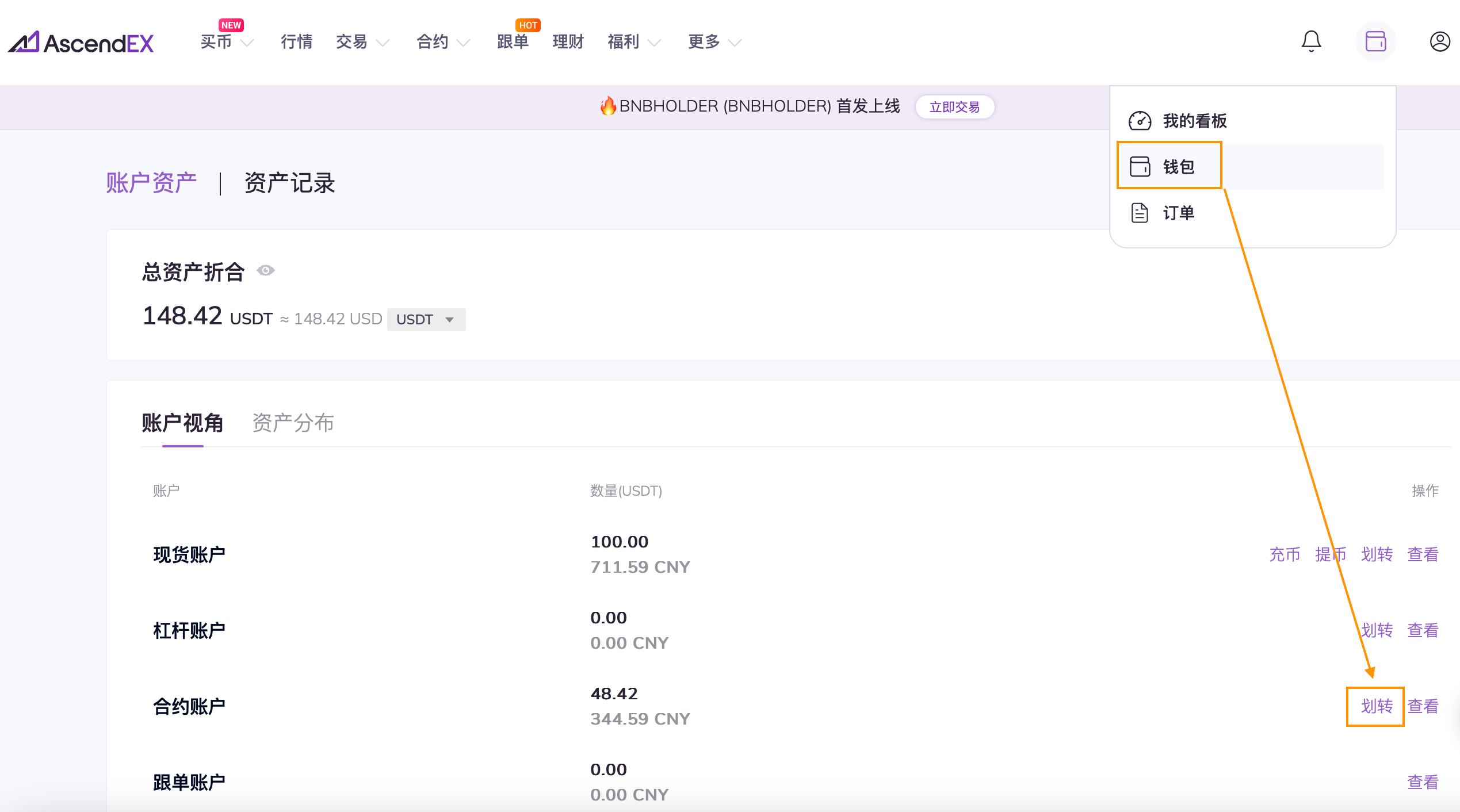 合约保证金可在钱包页面或交易页面划转,可选择从现货/杠杆/理财账户转入,实时到账无需手续费!